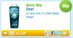 Save $.50 on your next purchase of ANY Bottle of Zest Body Wash! Simply click here and use zip code 77477 to print out your coupon. Plus, you’ll also find a $.50 off coupon valid for a Zest Soap (3-pack or larger)!
