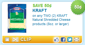 Here’s a new coupon valid for $.50/2 Kraft Natural Shredded Cheese (8oz. or larger)! Simply use zip code 77477 and click the “Foods” category to locate this coupon! Print this coupon out while you can, it probably won’t be up for long!