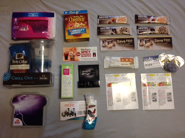Free Tampax Radiant Sample Pack, Free Honey Nut Cheerios Sample, Free Spicy Chicken McBites Product Coupon, Free Mascara Sample, Free Zone Perfect Bar, Free Sleep Sheets Samples + Coupon, Free Gain Coupons, Free Sandwich Lunch Box from Rudi’s, Free Peet’s Coffee Full Size Bag of Iced Coffee + Tumbler, Free Scotchguard Sample + Coupon, And Various Magazines