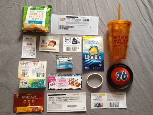 Free Jimmy Dean Tumbler, 76 Honk Suppressor, Good Do-er Wristband, Woolite Sample + Coupon, $1 off Puffs Coupon, Free Valspar Sample at Lowe’s Coupon, Skinny Cow Divine Chocolates Product Coupon, Pedia-Lax Sample + Coupon, Tom’s of Maine Toothpaste Sample + Coupon, Green Giant Chips, Friskies Cat Food Product Coupon, And Various Magazines