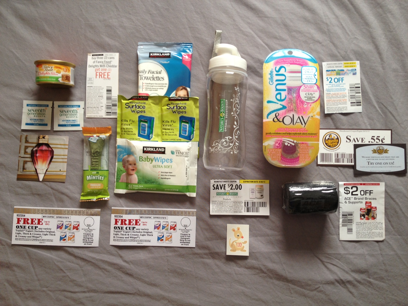 Free Fancy Feast Cat Food + Coupon, 2 Free Yoplait Product Coupons, Free Samples of Kirkland Wipes, Free Nature’s Bounty Bottle + Coupon, Free Venus & Olay Razor + Coupon, Free La Tortilla Product Coupon, Free Ace Bandage + Coupon, Free NaturMe Tattoo, And Various Magazines