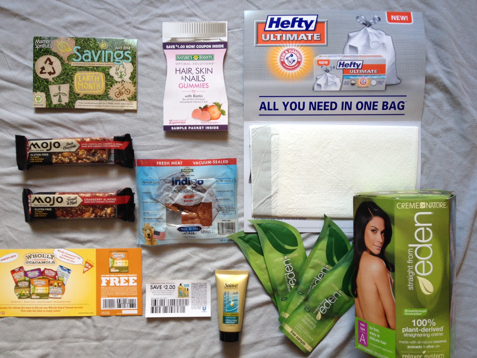Free Sample of Nature’s Bounty Gummies + Coupon, Free Sample of Hefty Trash Bags + Coupon, Free Creme of Nature Relaxer System + Samples, Free Wholly Product Coupon ($6.99 value), 2 Free Clif Mojo Bars, Free Sample of Indigo Dog Treats, And Various Magazines