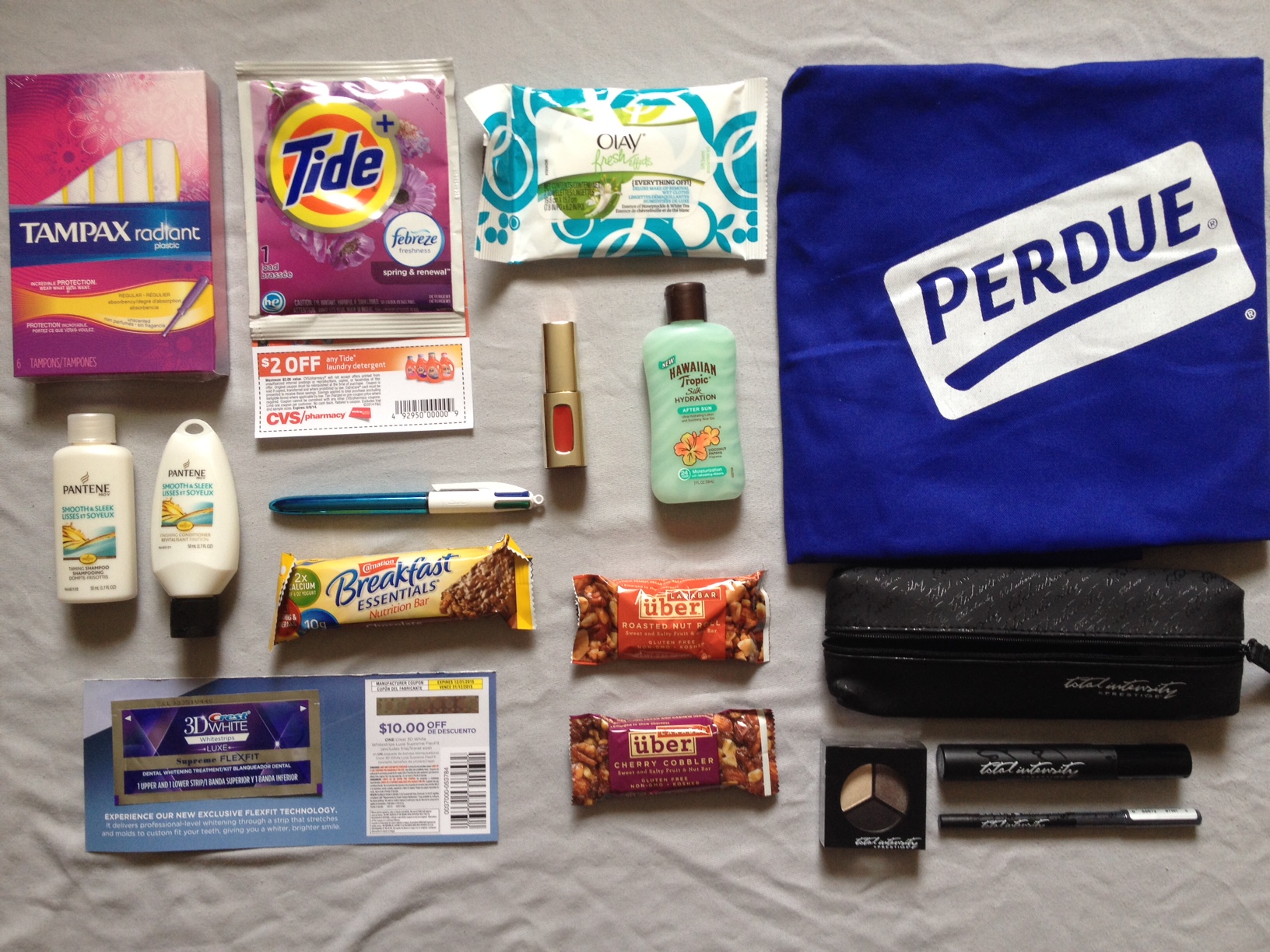 Free Apron from Perdue, Free Cosmopolitan S.O.S. Kit (Olay, L’Oreal, and Hawaiian Tropic freebies), 2 Free Samples of Larabar Uber Bars, Free Carnation Breakfast Essentials Bar, Free BIC 4-Color Pen, Free Tide Sample + Coupon (not sure how I keep getting these), Free Beauty Box from Orgullosa (Tampax, Pantene, Crest), Free Prestige Cosmetics Products + Bag (Win), And Various Magazines