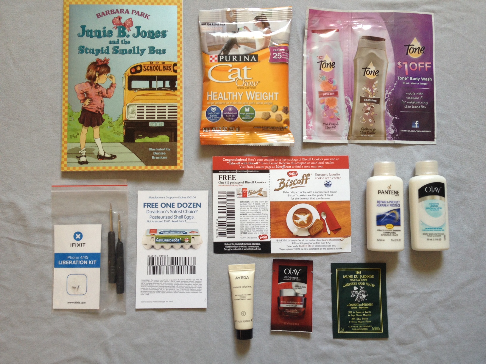 Free Junie B. Jones Book, Free Tone Body Wash Samples + Coupon, Free iPhone iFixit Kit, Free Davidson’s Safest Choice Eggs Product Coupon, Free Aveda Smooth Infusion Sample, Free Olay Regenerist Sample + Coupon, Free Hand Cream Sample, Free Sample of Pantene Shampoo, Free Sample of Olay Body Wash, And Various Magazines