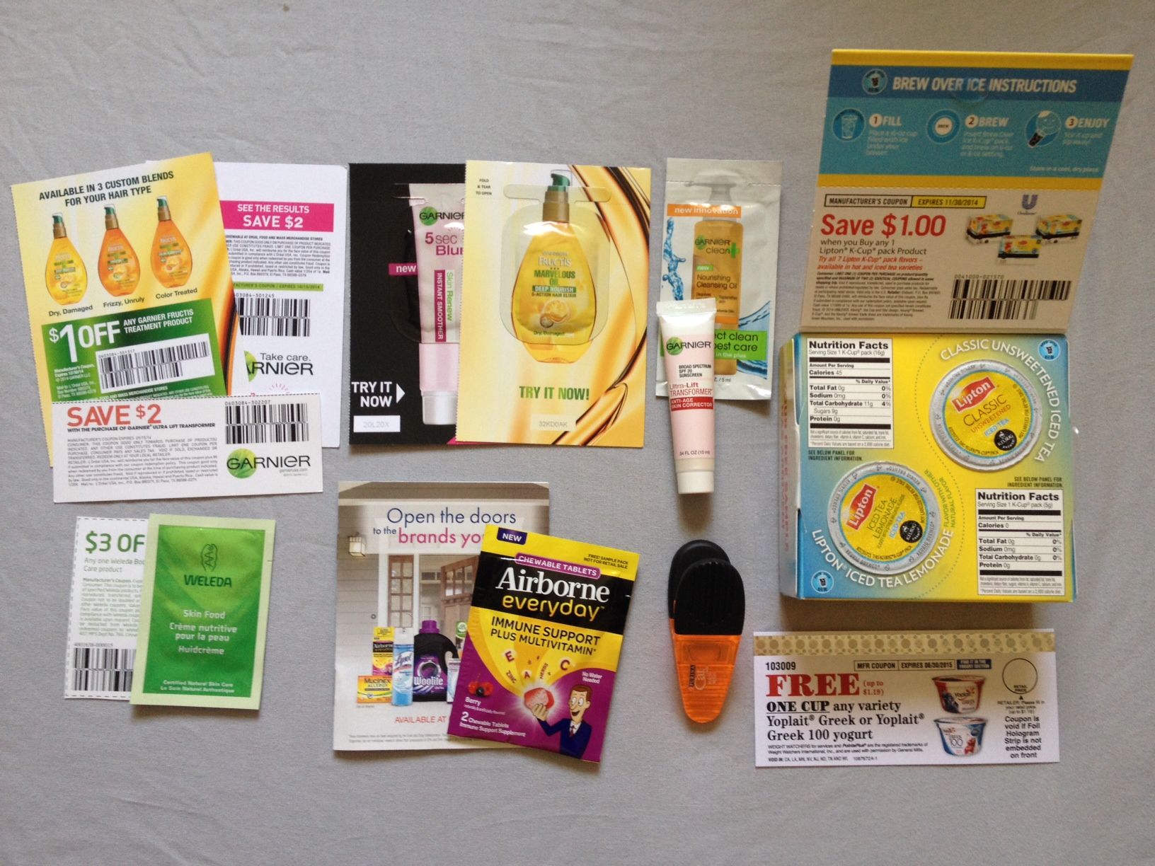 Free Various Samples of Garnier + Coupon, Free Sample of Weleda Skin Food + Coupon, Free Sample of Airborne + Coupon Booklet, Free Purina Chip Clip, Free Yoplait Product Coupon, and Free Various Magazines.