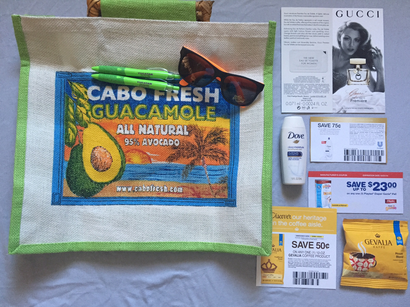 Free Cabo Fresh Prize Pack (Tote Bag, Pens, Sunglasses), Free Sample of Gucci Premier Fragrance, Free Diaper Genie Product Coupon, Free Gevalia Coffee Sample + Coupon, and Free Various Magazines.