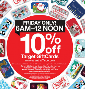 It’s live! Now through 1PM ET (12PM central time), Target is offering 10% off Target Gift Cards, both in-stores and online at Target.com! If you are planning on gifting some Target Gift Cards this Holiday season, make sure to take advantage of this. Even if it’s for yourself…you might as well save 10%! 😀