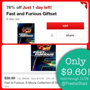 Target just released a hot Cartwheel offer valid for 76% off Fast & Furious Gift Sets! The DVD gift sets are priced at $39.99, making them just $9.60 after Cartwheel! The fine print doesn’t exclude Blu-ray, but for some reason, but I’ve heard reports of the offer not working with the Blu-ray sets (speak with a manager to push it through). The Blu-ray sets are $59.99, so just $14.39 after this offer. Valid through November 26th.