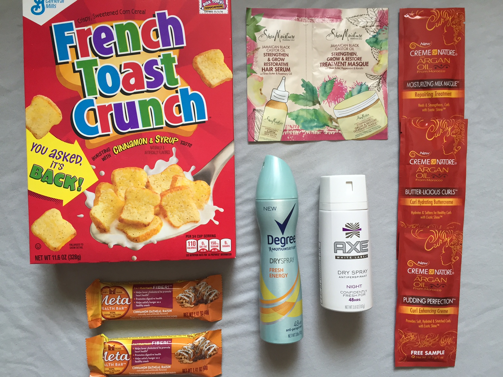 Free Full-Size Box of French Toast Crunch, Free Full-Size Degree Dry Spray, Free Full-Size Axe Dry Spray, Free Sample of Jamaican Black Castor Oil , Free Samples of Creme of Nature Argon Oil, and Free Various Magazines.