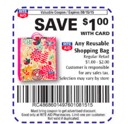 If you’re a Rite Aid shopper, be sure to grab the weekly ad this week! You’ll find a $1 off any reusable shopping bag Rite Aid store coupon in there, valid this week (through August 15th). Look for the $1 bags, and you’ll get one for FREE! There is a limit of 1 coupon per customer.