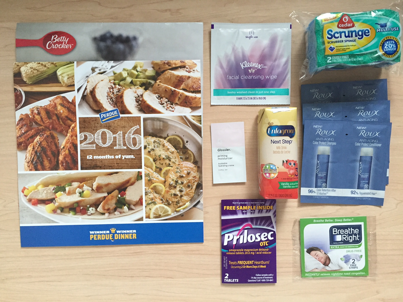 Free 2016 Betty Crocker Calendar, Free 2016 Perdue Calendar, Free Sample of Kleenex Facial Wipes, Free O-Cedar Sponges, Free Samples of Roux Hair Care, Free Sample of Prilosec, Free Sample of Glosier Priming Moisturizer, Free Sample of Enfamil Next Step Drink, and Free Various Magazines.