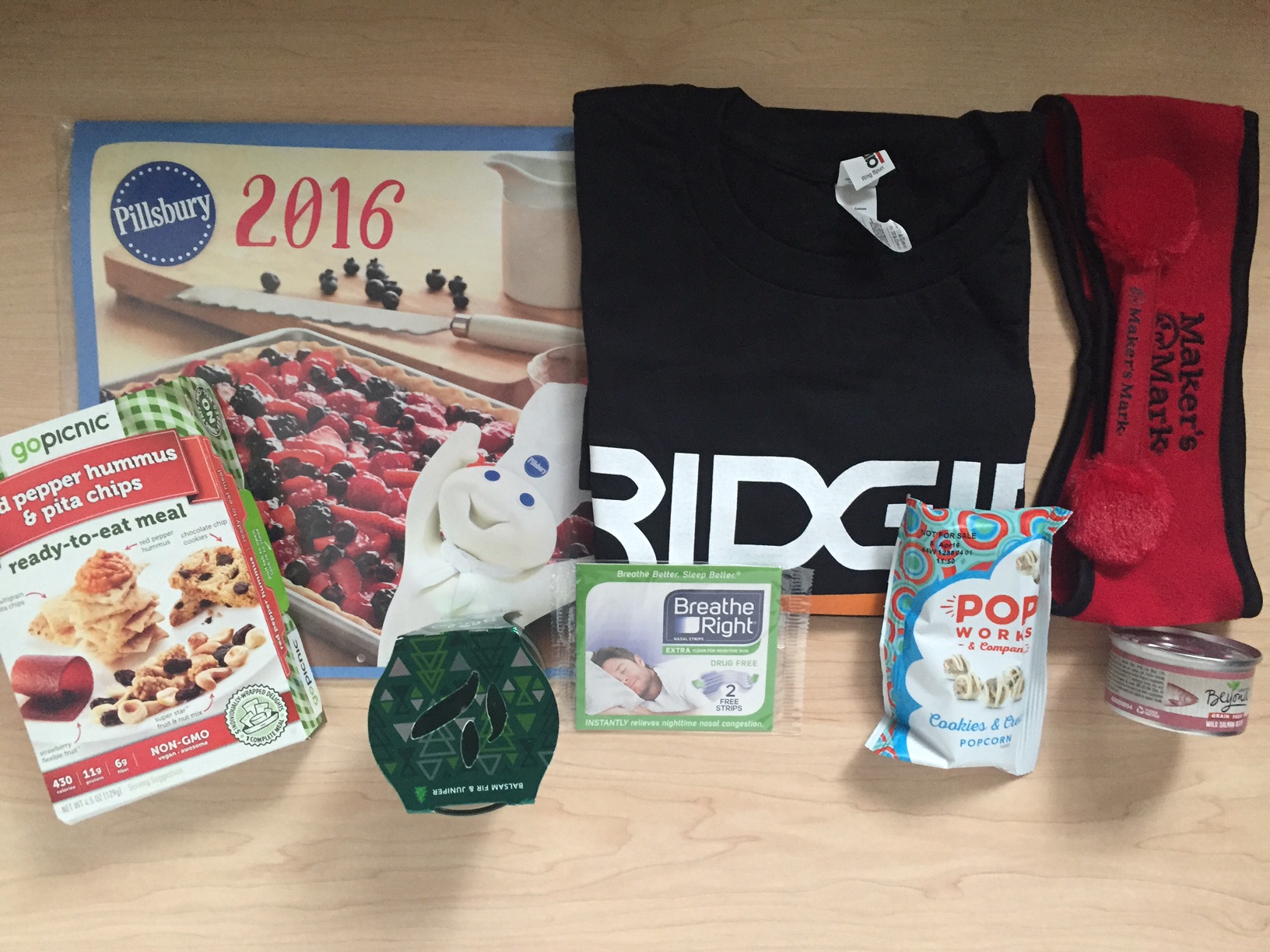 Free 2016 Pillsbury Calendar, Free Glade Candle, Free GoPicnic Ready-to-Eat Meal, Free Sample of Pop Works Popcorn, Free Sample of Purina Beyond Cat Food, Free Ridgit T-Shirt, Free Maker’s Mark Handband , and Free Various Magazines.