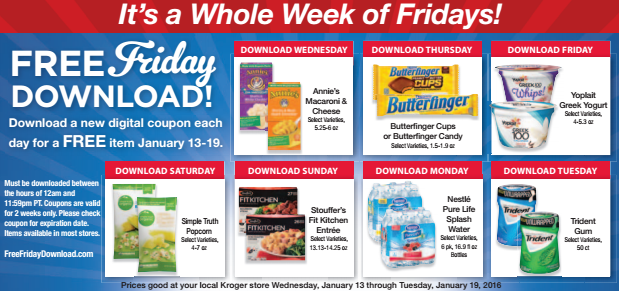 Kroger shoppers, here’s another exciting promotion for you! Starting January 13th, Kroger will be offering FREE Products EVERYDAY for a Week…it’s a whole week of Freebie Fridays! 😀 You’ll be able to load a new freebie on your card each day through January 19th. I’ll make sure to remind you all to load these freebies. Here’s the freebies being offered up: