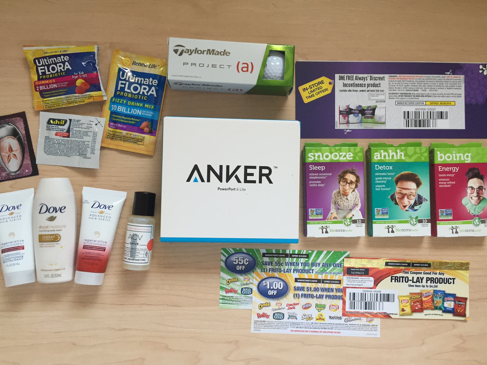 Free Dove Sample Pack, Free Sample of ACV Hair Rinse, Free Sample of Mugler Fragrance, Free Sample of Advil, Free Samples of Ultimate Flora, Free TaylorMade Golf Balls, Free Always Discreet Product Coupon, Free Anker Product (IWG Win), Free Samples of BioTerra Herbs, Free Frito Lay Product Coupon, and Free Various Magazines.