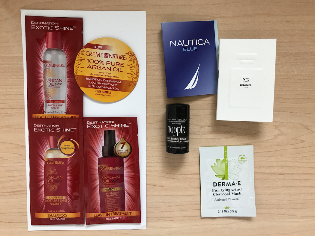 Free Samples of Creme of Nature, Free Sample of Derma E Facial Mask, Free Sample of Nautica Blue, Free Sample of Chanel Perfume, and Free Various Magazines.