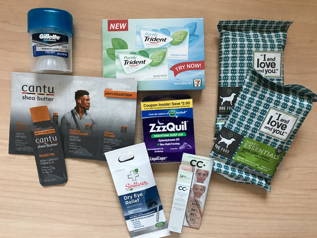 Free Samples from PinchMe, Free Sample of I and Love and You Dog Food, Free Pack of Purely Trident Gum, and Free Various Magazines.
