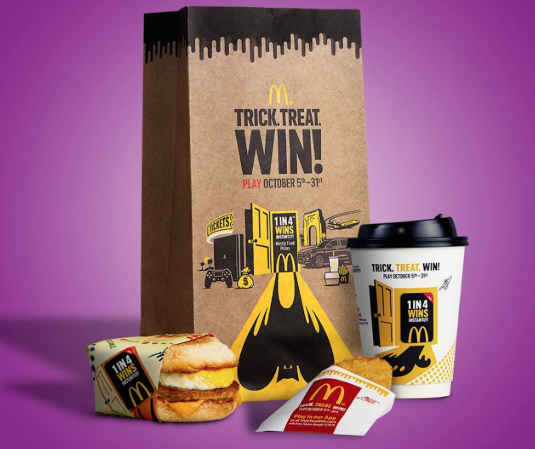 McDonald’s just launched a new Halloween themed giveaway for you to try your luck on! Now through October 31st, you can enter this new McDonald’s “Trick. Treat. Win!” Sweepstakes for your shot at winning one of thousands amazing prizes! You can win instantly by peeling game pieces on certain McDonald’s packaging or enter sweepstakes by adding codes found on those game pieces. You can also mail-in for free game pieces (check section 3B of the rules).