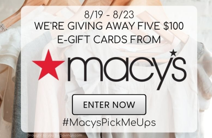 Enter the Macy’s $100 Gift Card Sweepstakes for your shot at winning 1 of 5 FREE $100 Macy’s Gift Cards! Simply enter your e-mail address by August 23rd to get your one-time entry in. Winners will be notified via e-mail on August 24th. Good luck!