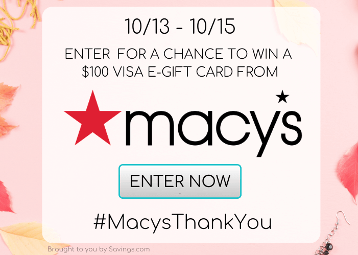 Enter the Macy’s $100 Gift Card Sweepstakes for your shot at winning 1 of 5 FREE $100 Macy’s Gift Cards! Simply enter your e-mail address by October 15th to get your one-time entry in. Winners will be notified via e-mail on October 16th. Good luck!