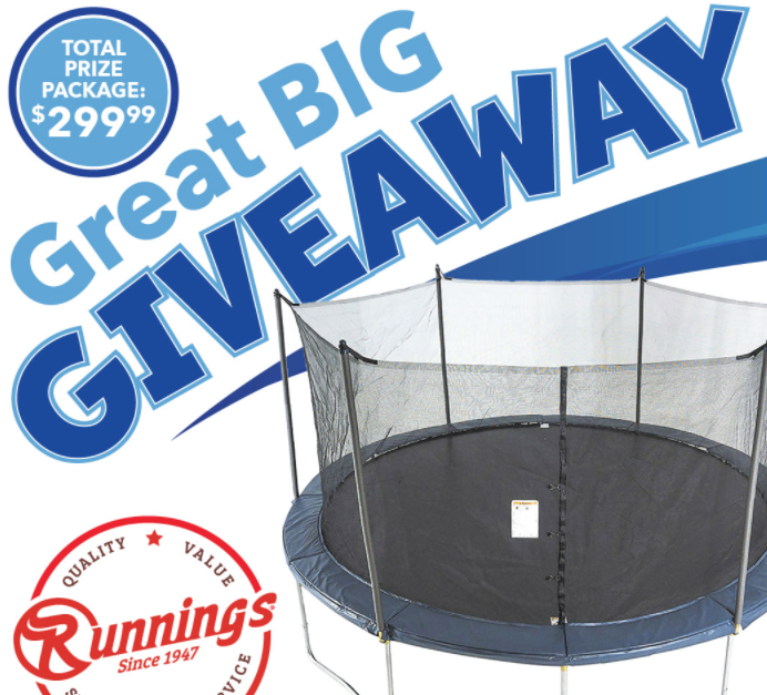 I know you all love sweepstakes that have trampolines as prizes, and here’s another one! Now through April 30th, you can enter this new Runnings Great Big April Sweepstakes! One lucky winner will score this trampoline — valued at $300! One-time entry sweepstakes. Good luck!
