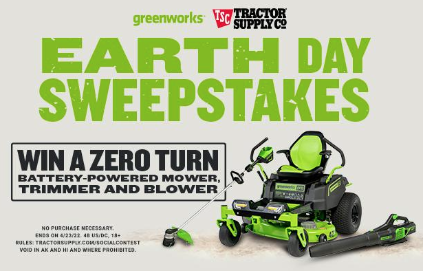 Tractor Supply is celebrating Earth Day! A total of 6 battery-powered yard tools worth up to $5,400 are up for grabs! Just enter this Tractor Supply “Earth Day” Sweepstakes once by April 23rd for your shot to win. Void in AK and HI. Best of luck!