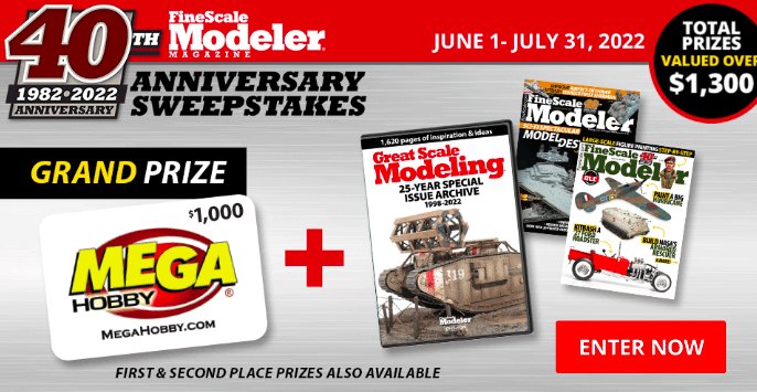 Enter this new USAToday “Finescale Modeler 40th Anniversary” Sweepstakes and you could win a $1,000 shopping spree and other prizes! You may uncheck all the e-mail subscription boxes. Enter daily through July 31st. I would love to see one of you win this. Good luck!