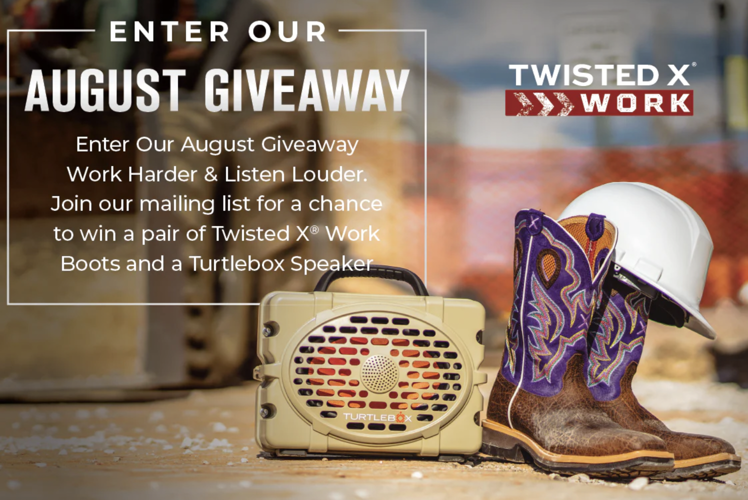 New sweepstakes alert! Enter this new Twisted X Work Footwear Sweepstakes for your shot at winning a a pair of Work Footwear boots AND speaker ($800 value)! This is a one-time entry sweepstakes, so just be sure to fill out the form by August 31st to be entered. Good luck!