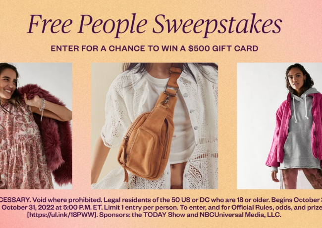Want to win a $500 gift card? Enter this TODAY x Free People Sweepstakes for your shot at winning 1 of 10 of them to Free People! Get your one-time entry in by 11:59PM ET tonight (10/31). Good luck!