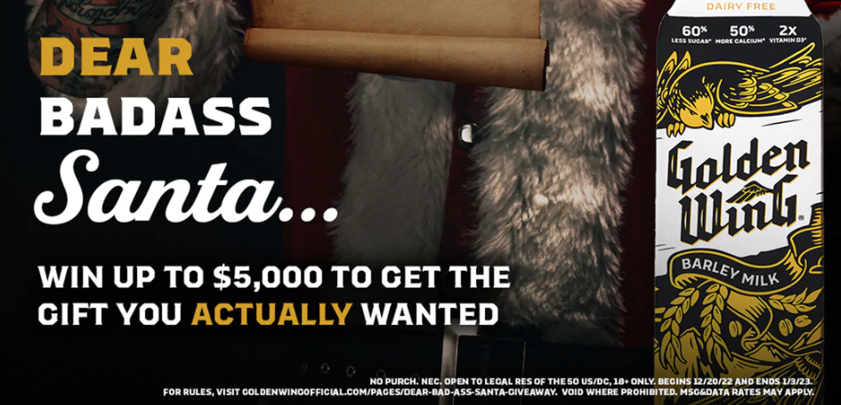 Ten lucky winners will score $500 check, and the grand prize winner will get $5,000! Just enter this Golden Wing “Dear Santa” Sweepstakes once per day through January 3rd to rack up the entries. All 11 winners will also get a 1-month supply of Golden Wing plant-based milk. Best of luck!