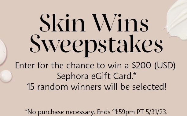 Enter this Sephora Skin Wins Sweepstakes and you could be 1 of 15 winners to score a $200 Sephora eGift Card! Just follow the instructions (you’ll need to leave a comment to enter). You can enter twice per day through May 31st. Good luck!