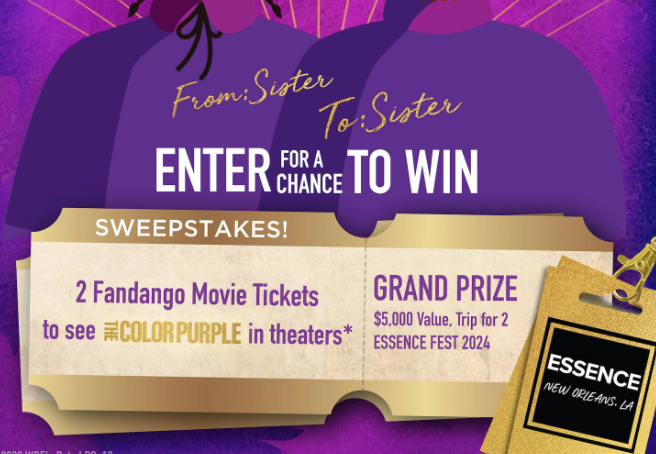 Enter this Carol’s Daughter Sisterhood Sweepstakes a chance to win a trip for TWO to Essence Festival 2024 ($5,000 value)! PLUS, 100 others will win a pair of Fandango Movie Tickets to see The Color Purple. Get your one-time entry in by January 31st. Good luck!