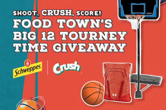 Five winners will be selected to score a prize pack from this new Food Town “Shoot, Crush, Score” Sweepstakes! Each winner will get a basketball goal, basketball, and Under Armour gym bag. Enter once by March 23rd. Good luck!