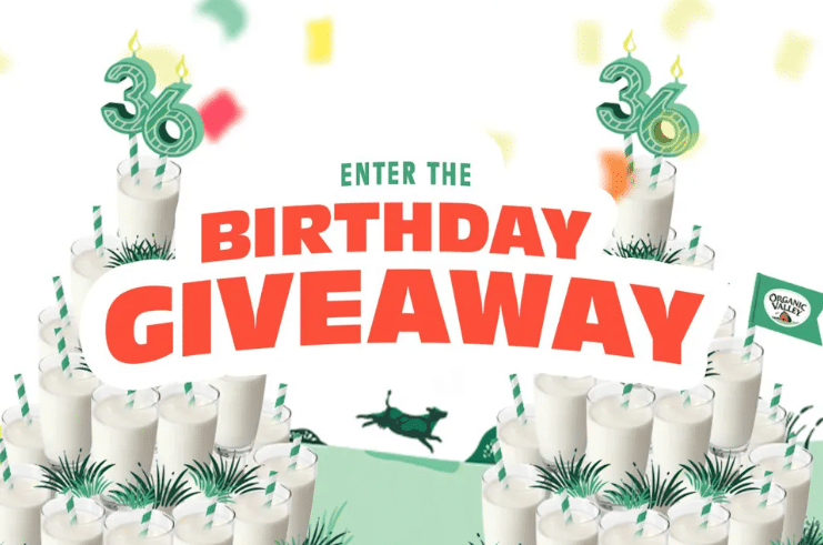 Send a quick e-mail to enter this Organic Valley 36th Birthday Sweepstakes! To enter via e-mail: OVgiveawayentries@organicvalley.com with the subject line: ORGANIC VALLEY® 36th BIRTHDAY GIVEAWAY. Qualifying entries must include the following information in the email body: Your name, home address (P.O. boxes not accepted), phone number, email address, date of birth, city and state.
