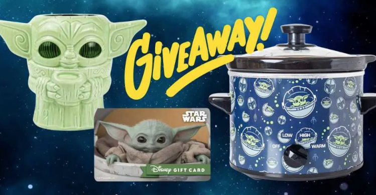 The prize is a $50 “The Child” Disney gift card, a Geeki Tikis “The Child” Mug, and The Mandalorian Slow Cooker.
