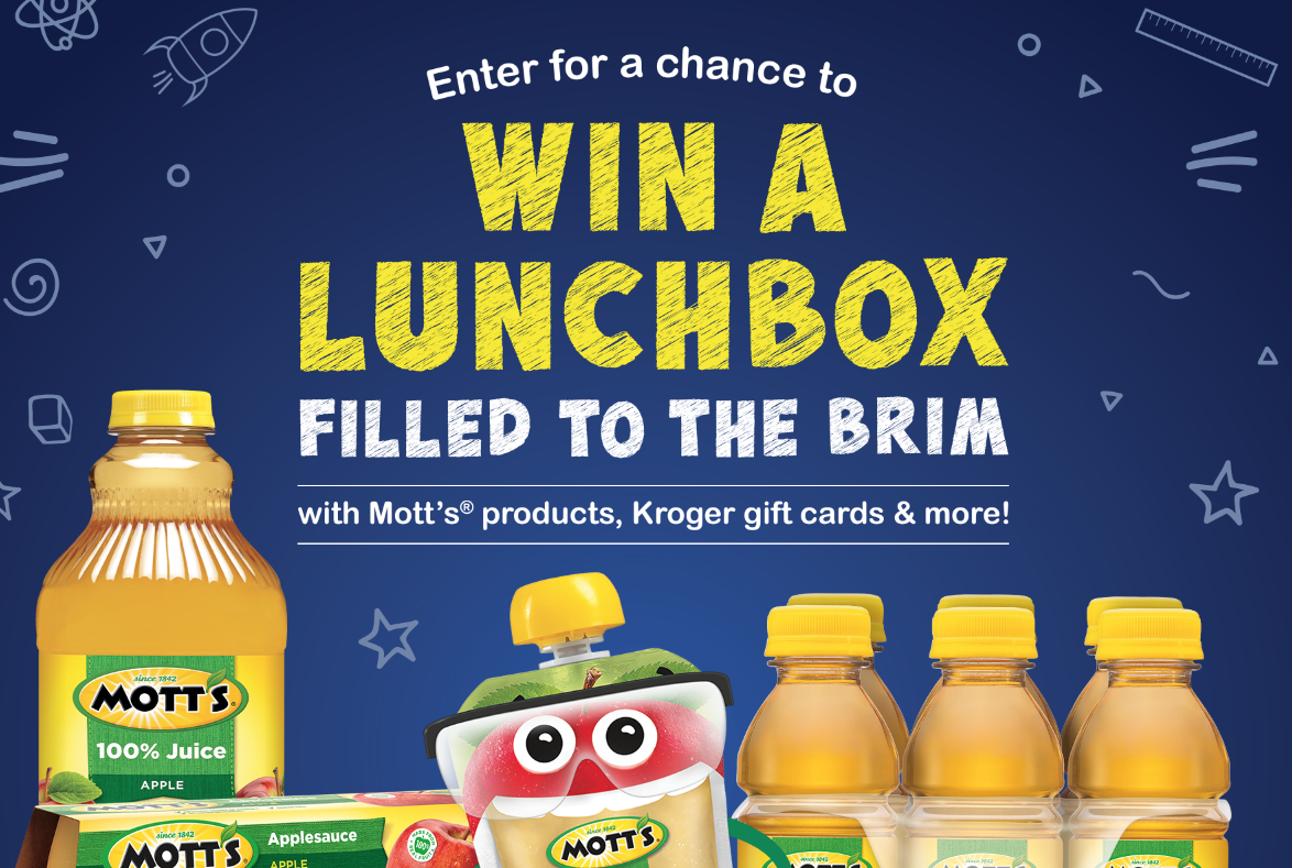 - 10 FIRST PLACE PRIZES: Mott’s Branded Lunch Box, $250 Digital Kroger Gift Card, and school supplies.