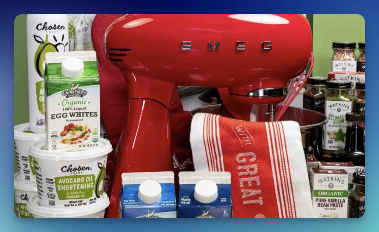- (1) Winner: A prize package including Bob’s Red Mill baking mixes, a SMEG stand mixer, cookware from GreenPan, and products from Chino Valley Ranchers, Chosen Foods, and Watkins.