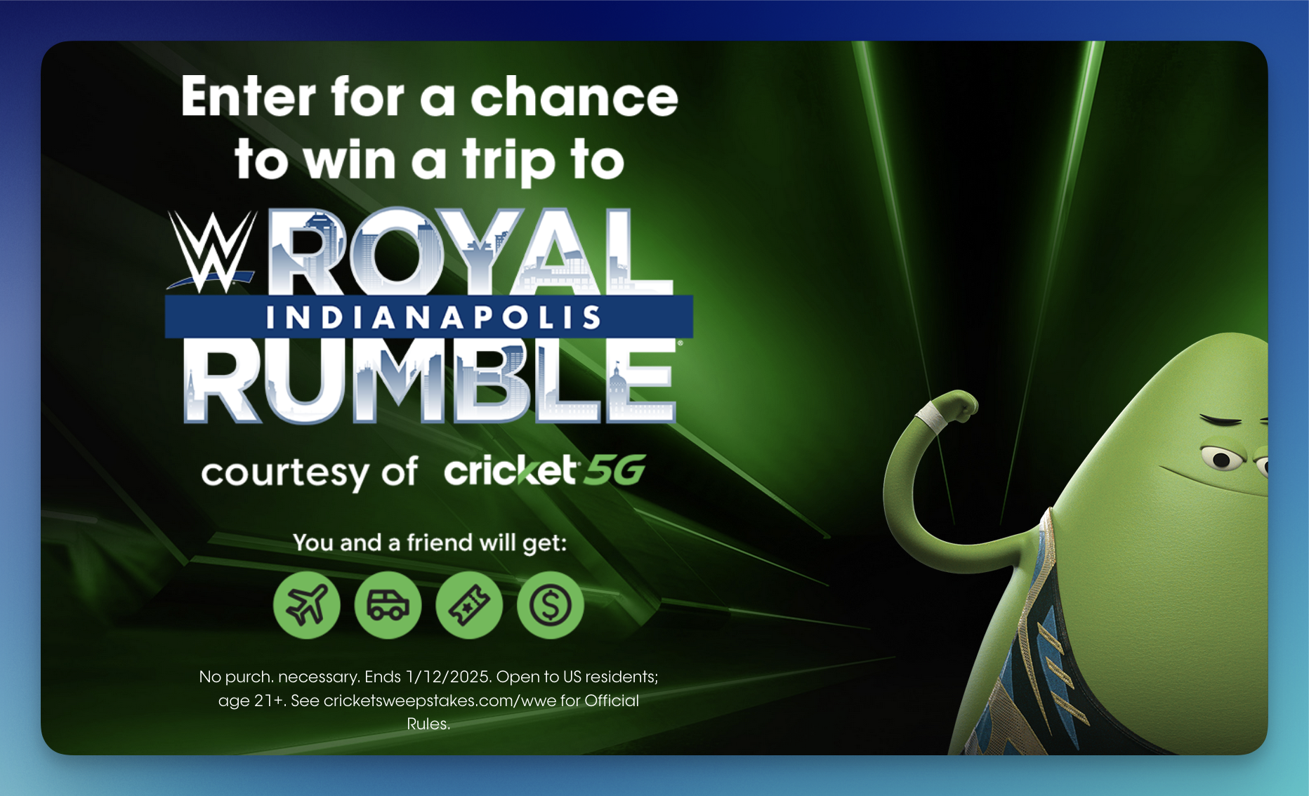 Step into the ring for the ultimate WWE experience! Enter the Cricket Wireless Royal Rumble Flyaway Sweepstakes daily for a chance to win an unforgettable trip to Indianapolis.