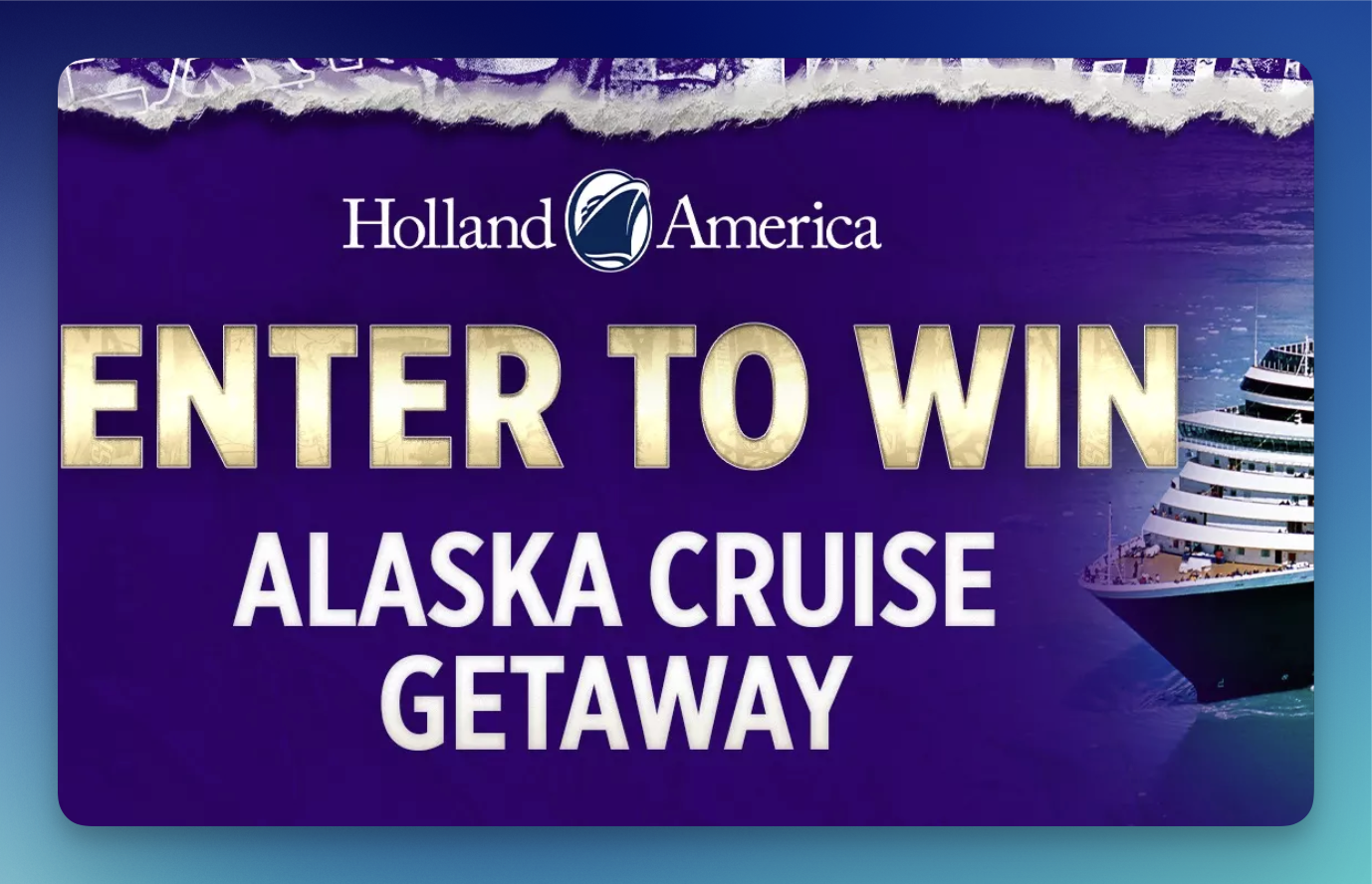Set sail for an unforgettable adventure! Enter the Holland America Enter to Win Sweepstakes daily for a chance to win an Alaska cruise for two.
