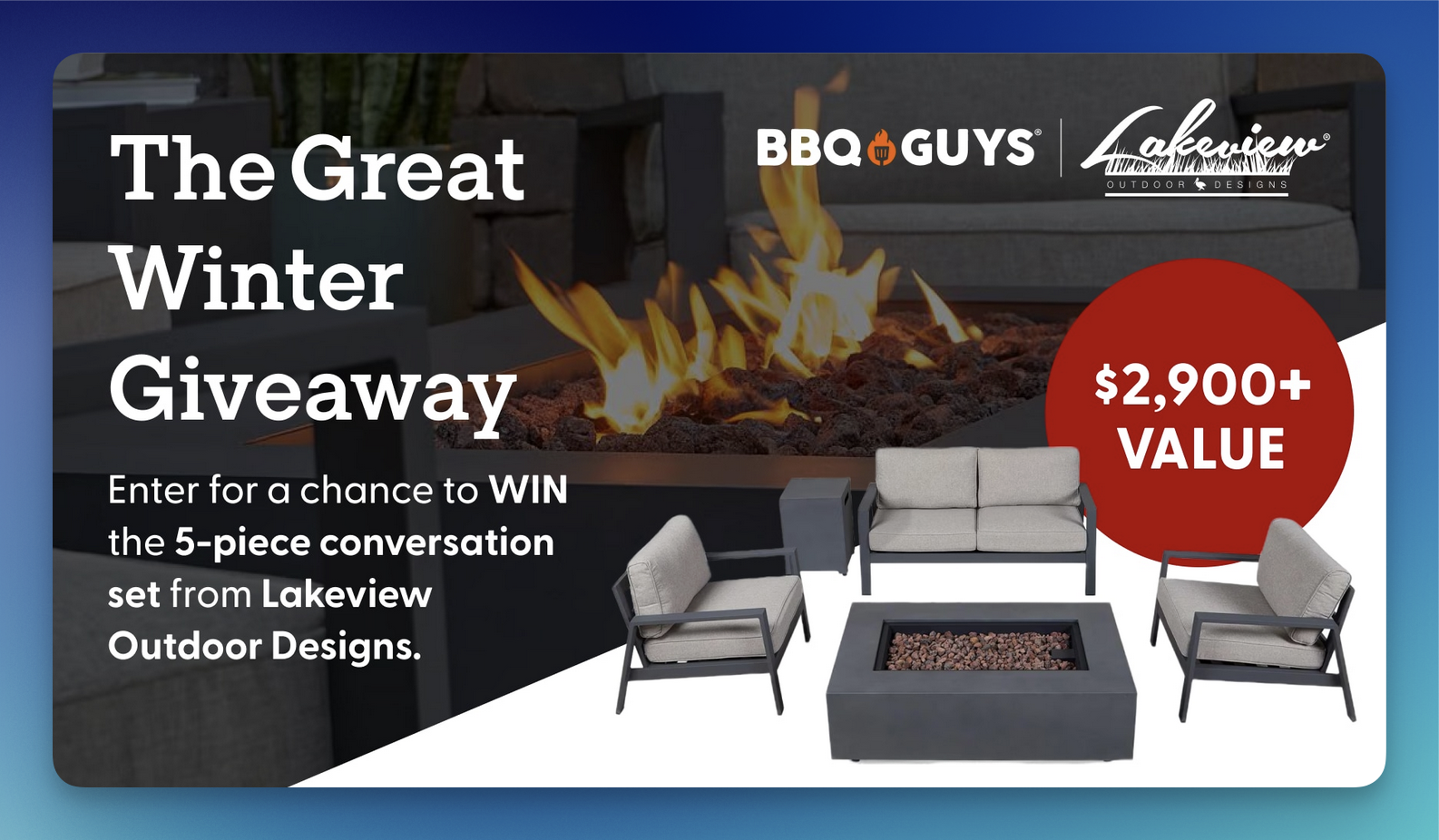 - Grand Prize (1): An Elysian 5-Piece Seating Set with a 50-inch Fire Pit in Weathered Slate by Lakeview Outdoor Designs (ARV: $3,392).