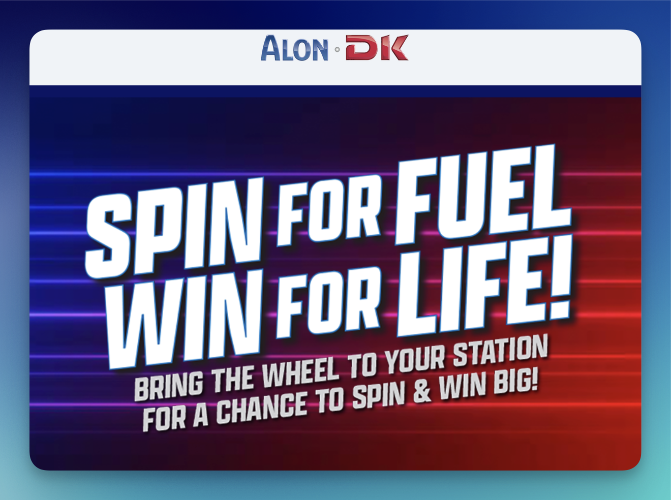 Take a spin and win big with the DK / ALON “Traveling Prize Wheel” Sweepstakes, where incredible fuel prizes are just a spin away!