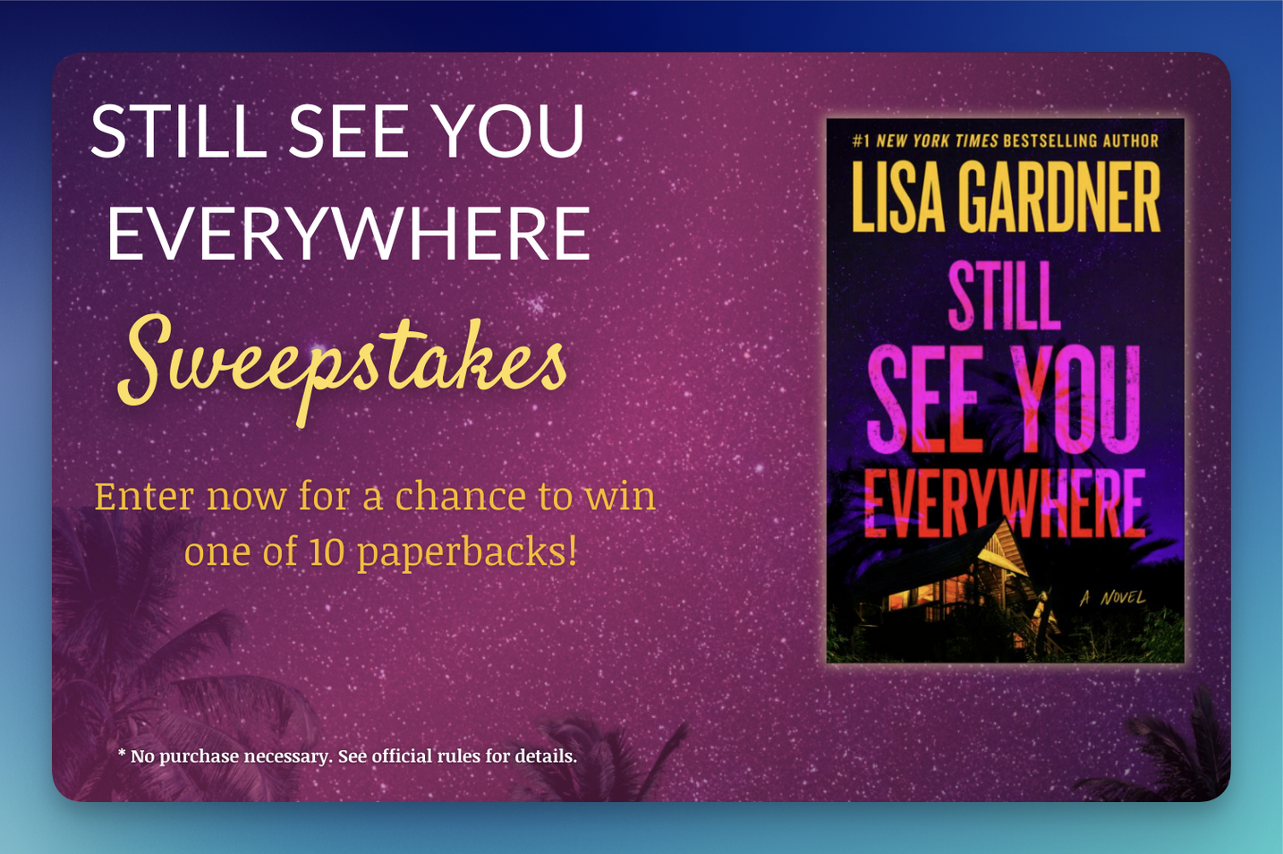 - (10) Winners: Each will receive a trade paperback copy of Still See You Everywhere from Grand Central Publishing