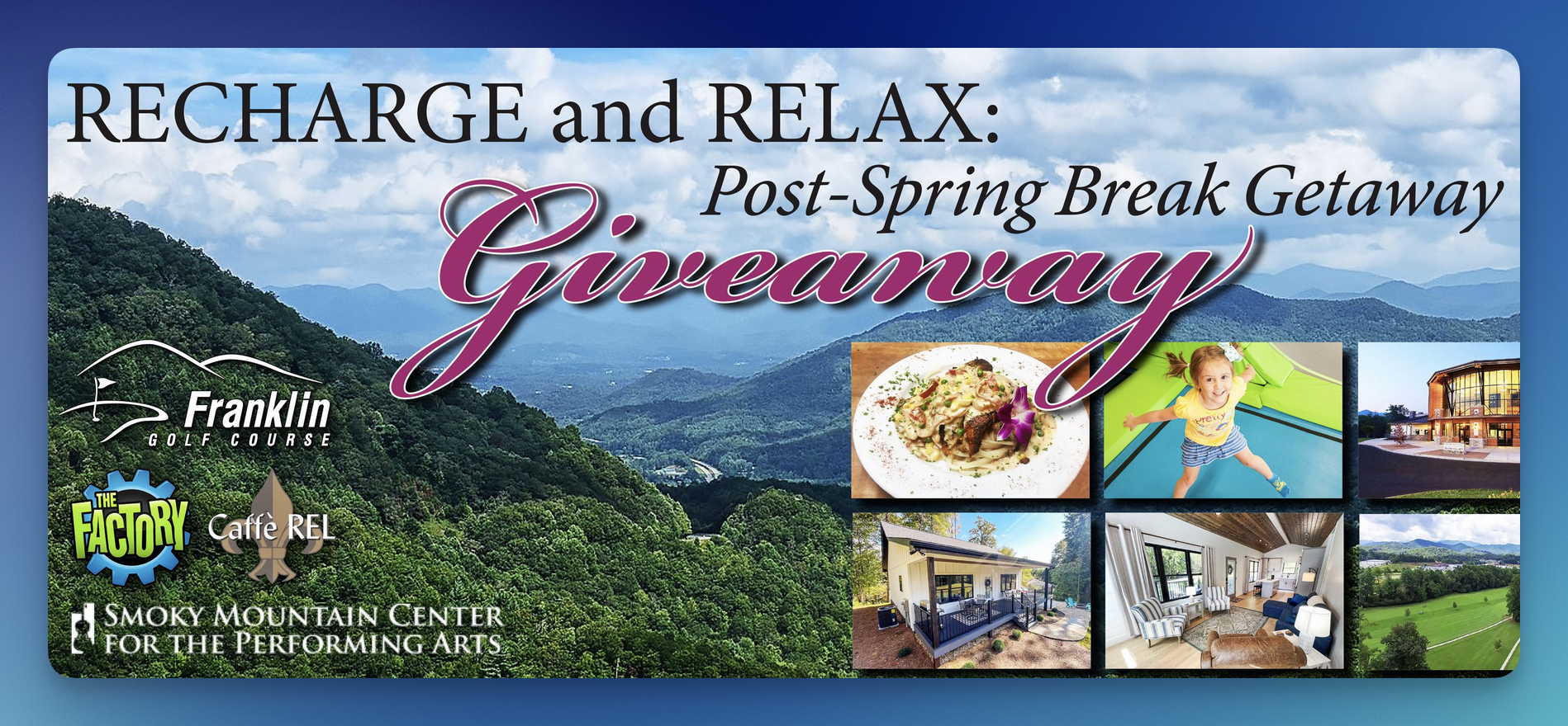 1 Grand Prize: A getaway package to Franklin, NC including a 2-night Vrbo stay, show tickets, golf, and gift certificates (ARV: $1,500)