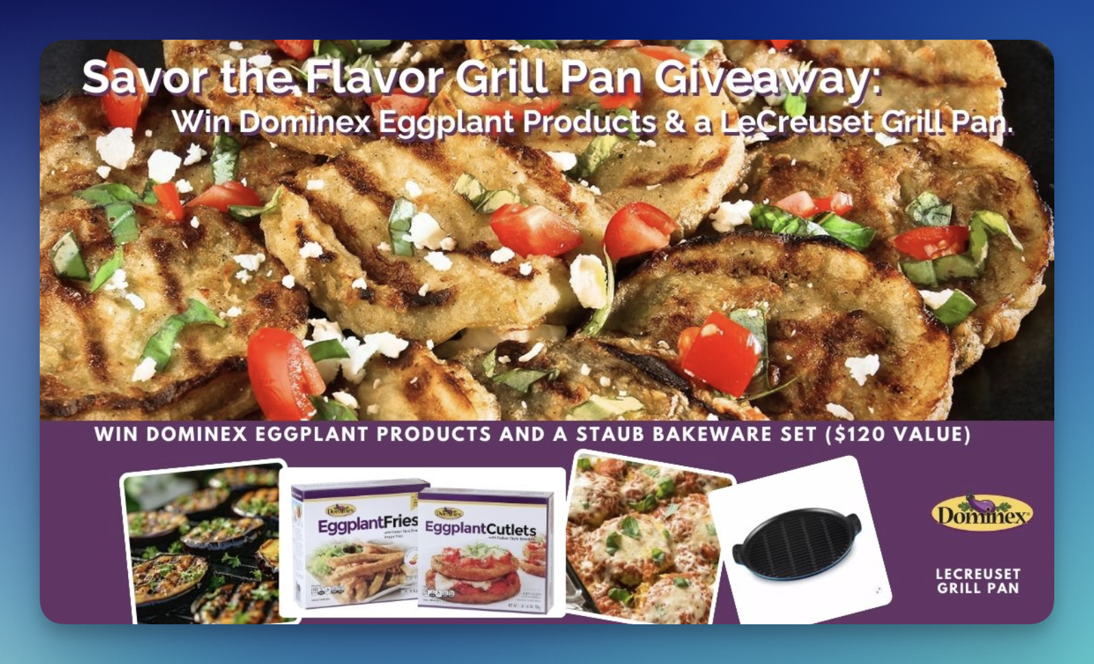 Fire up your kitchen with the Dominex Eggplant & LeCreuset Grill Pan Sweepstakes — one lucky winner will score premium cooking essentials!