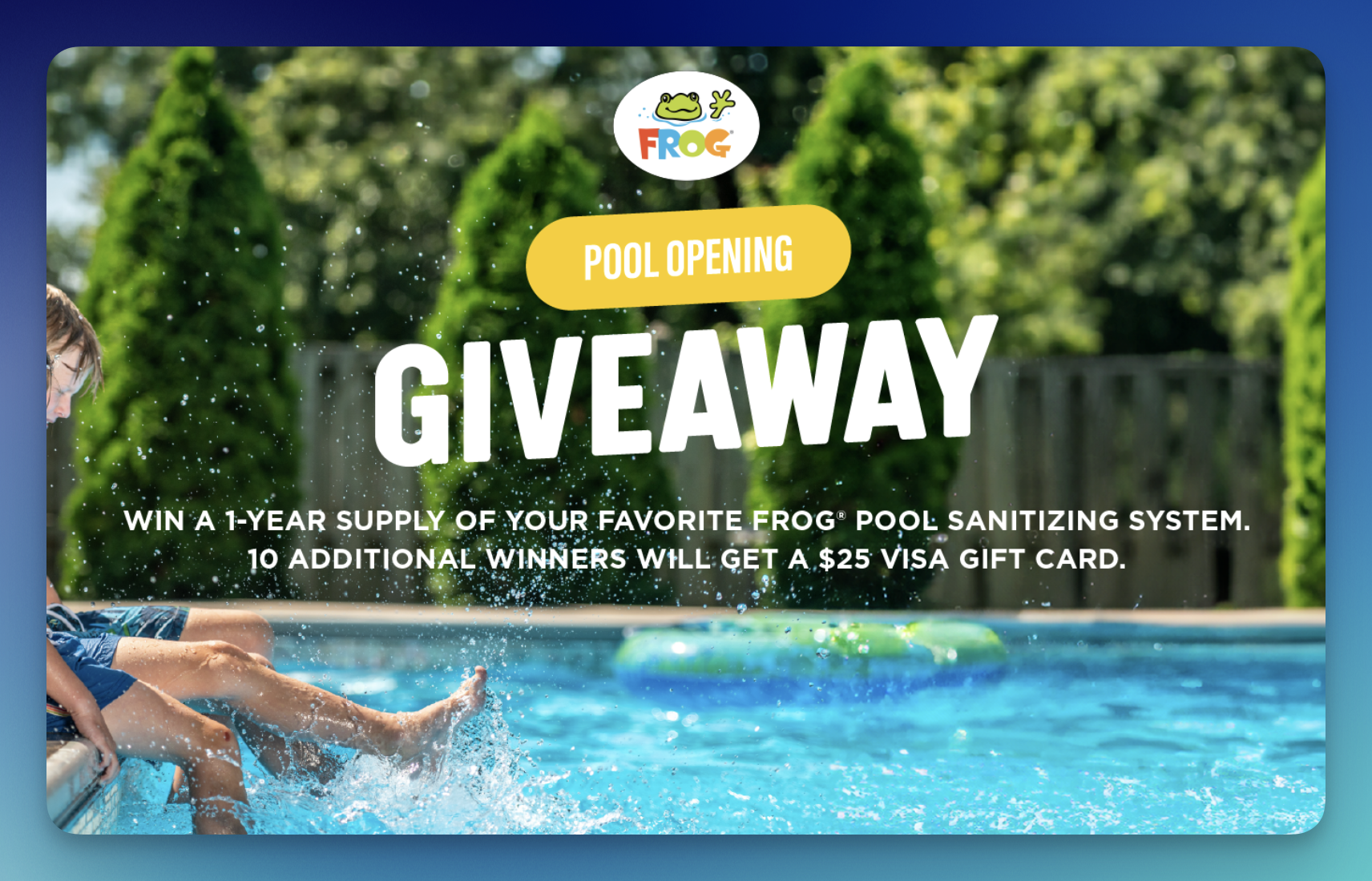 Dive into summer with the FROG Pool Opening Sweepstakes! One grand prize winner will enjoy a year’s worth of pool sanitizing products, and ten others will score Visa gift cards.