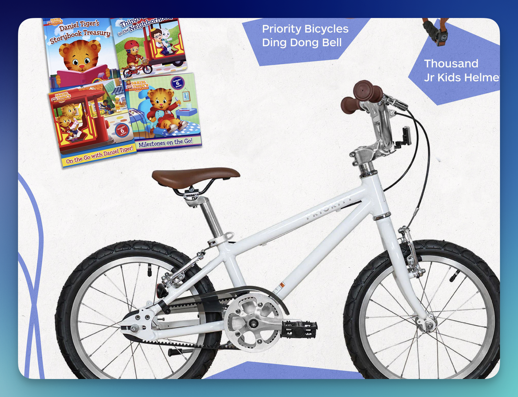 - (1) Grand Prize: Daniel Tiger book bundle, Priority Start 16” bike, helmet, and bell (ARV: $467.95)