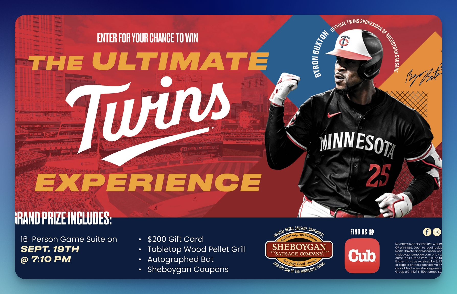 (1) Grand Prize: 16-suite tickets to the Minnesota Twins game on Sept 19, 2025, a tabletop wood pellet grill, $200 gift card, autographed bat, and Sheboygan product coupons (ARV up to $2,200)
