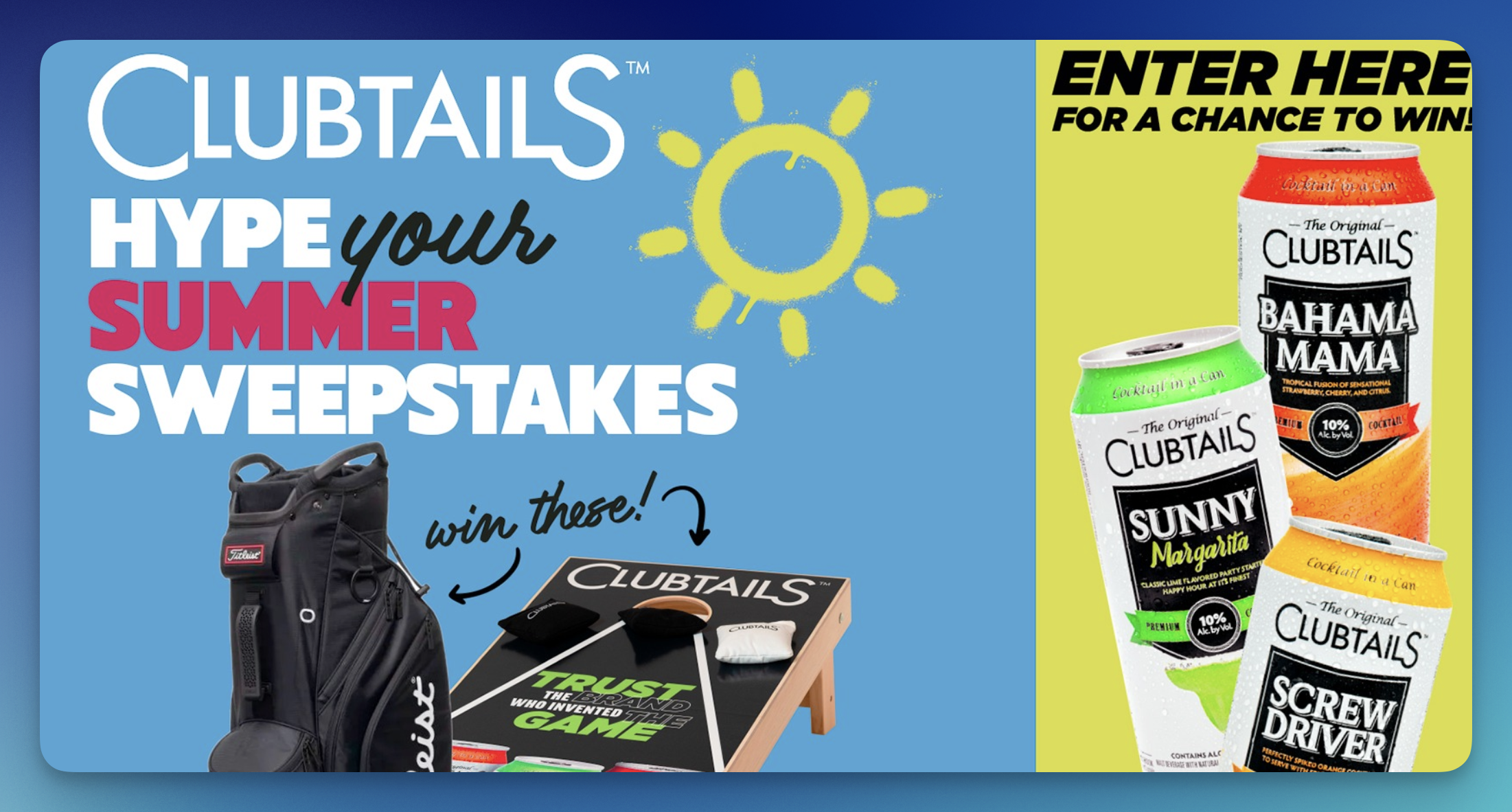 Sip, chill, and win with the Clubtails Cocktails Summer Sweepstakes—20 lucky winners will score branded golf bags or cornhole boards!