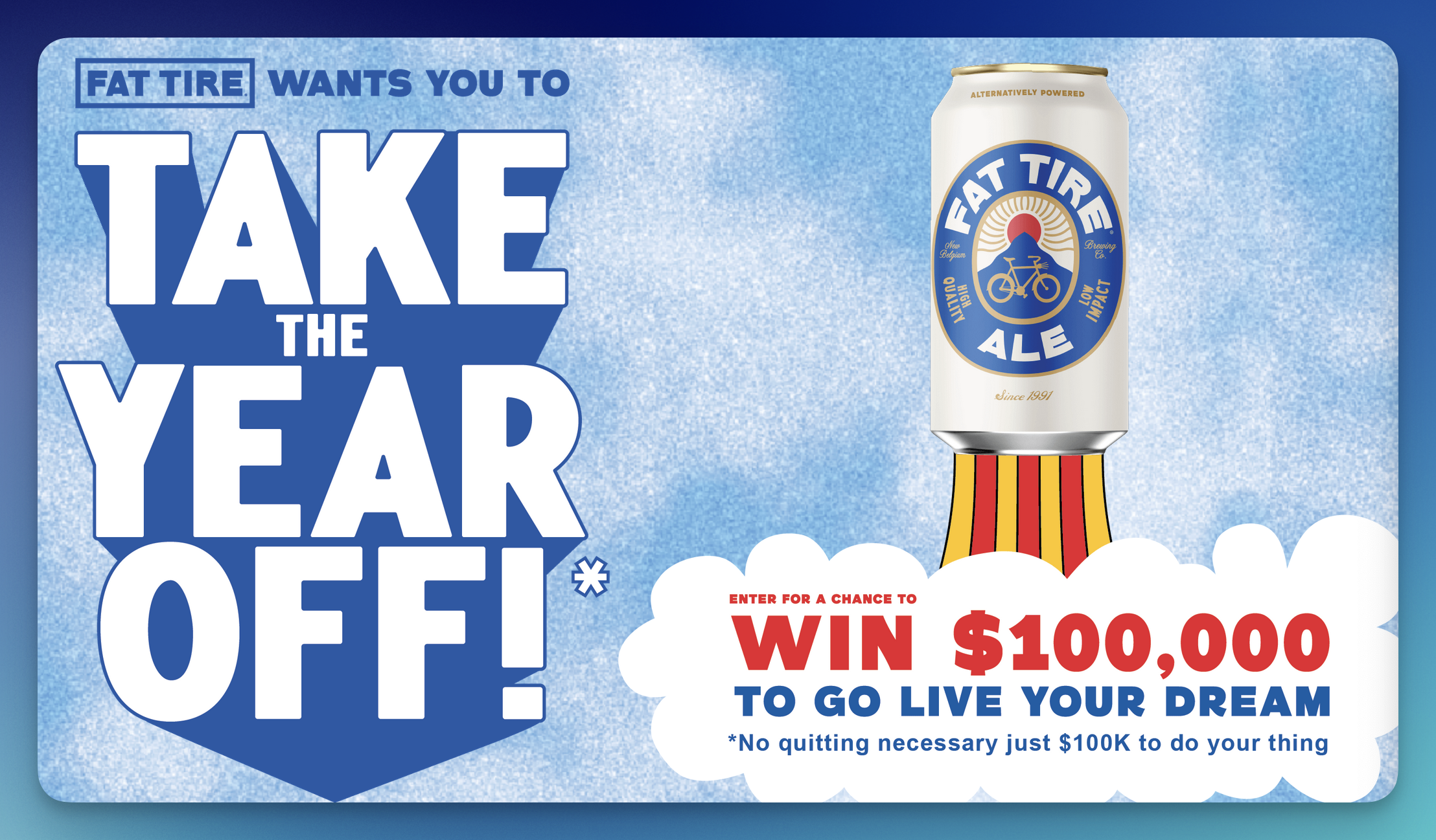 Bring your boldest dream to life with the Fat Tire Take The Year Off Contest — one winner will receive $100,000 to make it happen, plus ten others will enjoy a year of Fat Tire beer!