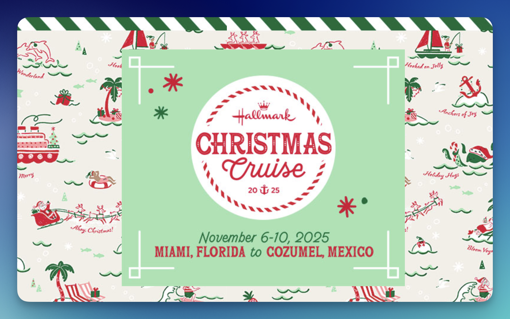 (1) Grand Prize: Hallmark Christmas Cruise package for two (Nov. 6–10, 2025) including a four-night stateroom from Miami, FL to Cozumel, Mexico, plus a $2,700 USD/$3,719.24 CAD travel and food allowance (ARV: $6,860 USD/$9,449.62 CAD)