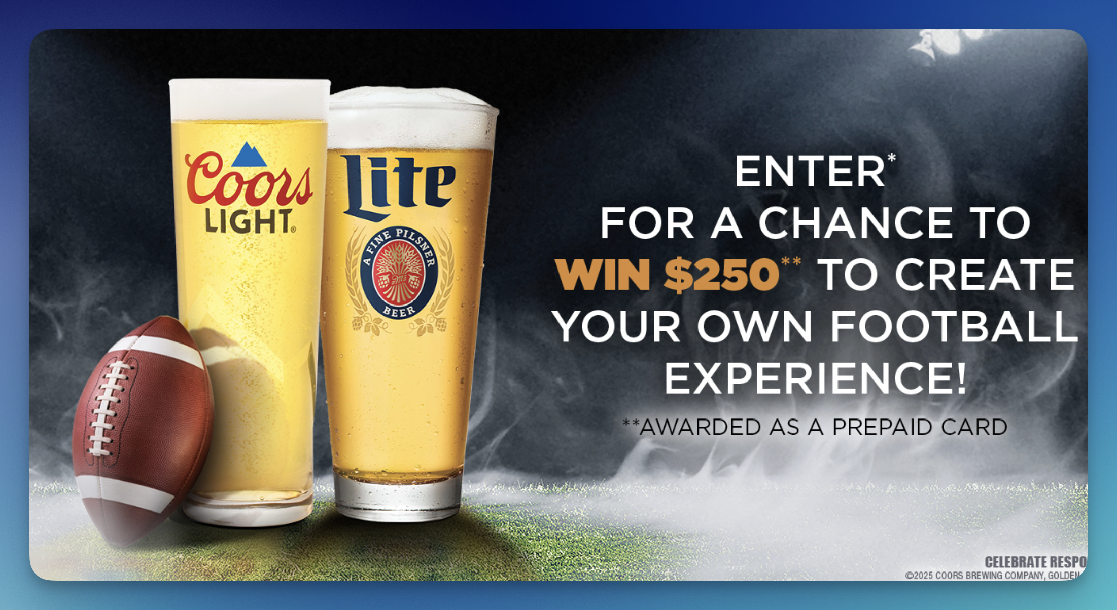 Kick off big prizes with the Molson Coors Football Experience Sweepstakes—41 winners will score $250 prepaid cards through national and keyword prizes!